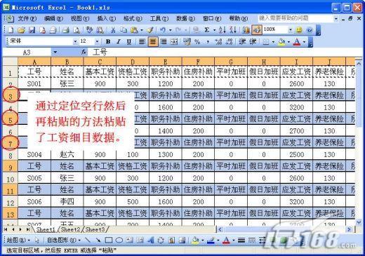 第四步:復(fù)制表頭的工資細目數(shù)據(jù),選中工資表A列的數(shù)據(jù)區(qū)域,執(zhí)行“編輯”→“定位”命令,在打開的“定位”對話框中單擊“定位條件”按鈕,在打開的“定位條件”對話框中,選擇“空值”,然后單擊“確定”按鈕,這時會選中剛插入的空行,執(zhí)行“編輯”→“粘貼”命令,這時工資條就算制作完成了(如圖7)。