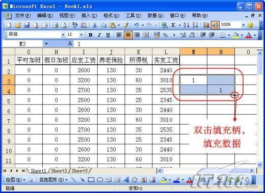 假設(shè)當前工資表中有300行數(shù)據(jù),顯然使用第一種方法是行不通的。首先復(fù)制第一行的工資細目數(shù)據(jù),從300行之后的任一行粘貼,并使用填充柄拖動復(fù)制300行。